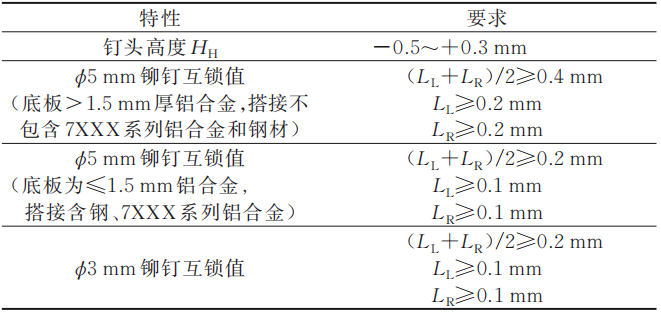 圖2 自沖鉚接質量指標 表1 互鎖值質量指標