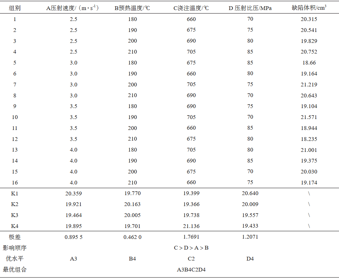 表3 正交試驗因素水平表 本試驗方案需要進行16組正交試驗,基于試驗方案中提供的數據,對殼體的充型與凝固過程進行模擬。并對以上16組數據的鑄件縮松、縮孔等缺陷體積大小進行統計對比,最后得到正交試驗數據如表4所示。