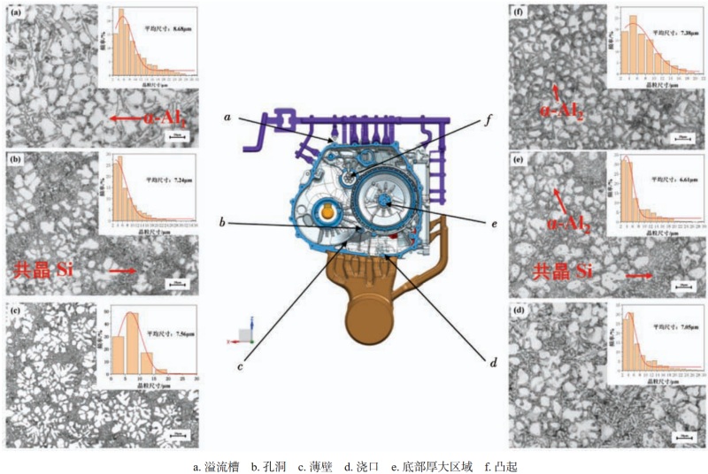 圖9 厚大區域金相圖 2.5 鑄件組織性能分析 在鋁合金殼體的鑄造過程中,不同結構處由于壁厚不同,凝固順序與冷卻過程也存在著差異,因此選取并觀察了鑄件出現缺陷風險較高、冷卻時間不同的六個特征位置(a溢流槽、b孔洞、c薄壁、d澆口、e厚大區域和f凸起),如圖10所示。殼體組織主要以α-Al與共晶Si為主,各區域都是等軸晶,其中共晶Si分布在α-Al周圍。初生α-Al相在圖中表現為兩種形式,分別為凝固過程中冷卻速率較低所形成較大的α-Al?,與冷卻速率較高所形成的較小的α-Al?。根據晶粒尺寸分布圖可以看到,溢流槽處,如圖10(a)所示,平均晶粒尺寸最大,且存在著較多尺寸較大的α-Al?相。底部厚大區域,如圖10(e)所示,平均晶粒尺寸最小,為較小的α-Al?相。其余孔洞、薄壁、澆口以及凸起區域晶粒尺寸相差不大,且多為尺寸較小的α-Al?相。