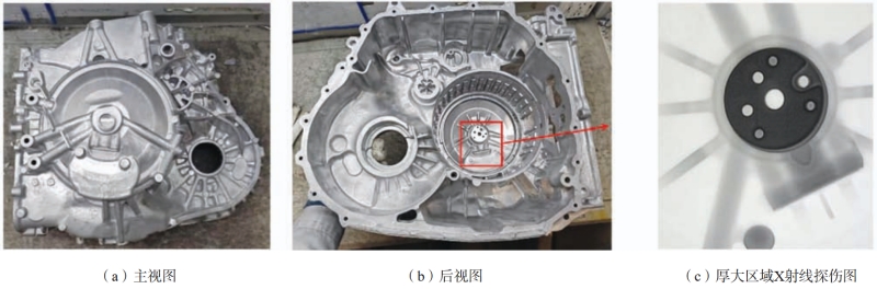 表7 優化后鑄件力學性能測試結果 通過實際生產試制,如圖14(a)和(b)所示,以及對出現缺陷風險較高的底部厚大區域進行X射線探傷檢測,如圖14(c)所示,可以確定得到了表面質量良好且無明顯的縮松、孔洞等缺陷的變速器殼體。因而綜合鑄件微觀組織觀察、力學性能測試以及實際生產驗證可以判斷,在該壓鑄工藝參數下得到的鑄件有著良好的表面質量與工藝性能