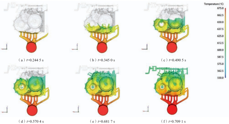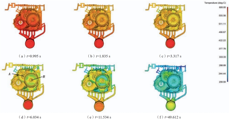 圖4 真空壓鑄鋁合金殼體的充型過程 圖5為真空壓鑄鋁合金殼體的凝固過程。鑄件的凝固趨勢沿重力方向形成一定溫度梯度,整體自排氣管道而下向澆口部位凝固,基本符合順序凝固的過程。在鑄件凝固時間t=6.034 s時,如圖5(d)所示,鑄件左上部存在著凸起(A),該形狀更易受較低的模具溫度的影響較早開始冷卻凝固,影響鑄件整體凝固順序,還可能會導致鑄件其余部位在凝固時缺少金屬液的補縮而出現縮松縮孔等缺陷。此外殼體底部的厚大區域(B)由于較大的壁厚,導致該區域冷卻速度較慢,溫度較高,此時周圍合金已經開始凝固,這會導致該處的凝固收縮無法得到金屬液補縮,形成了孤立液相區,產生熱應力,出現縮松縮孔等缺陷,影響該區域的微觀組織結構和力學性能。