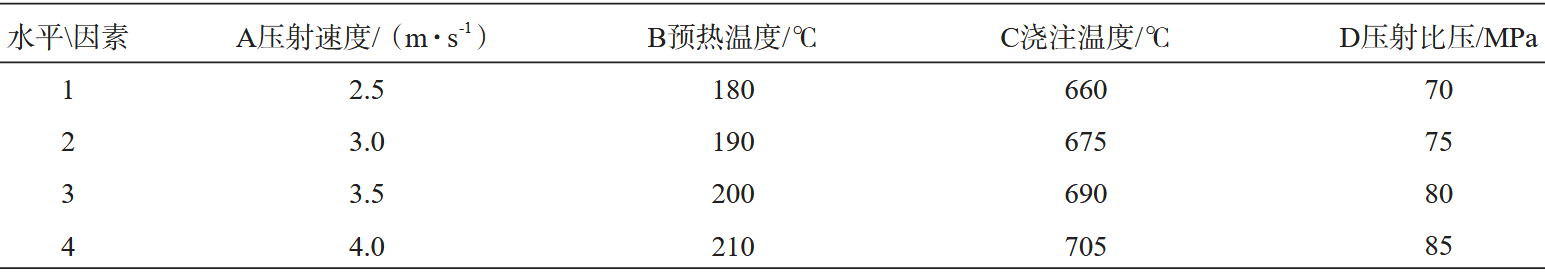 圖6 缺陷分析 2.3 正交試驗 基于章節2.1與章節2.2的分析,并結合實際生產經驗,選取四個對鑄件質量有重要影響的壓鑄工藝參數進行正交試驗,分別為:壓射速度(A)、模具預熱溫度(B)、合金液澆注溫度(C)以及壓射比壓(D),建立正交試驗因素水平表及試驗方案,如表3所示。