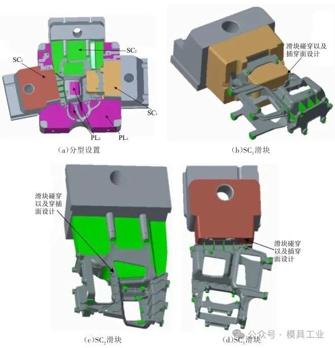 2.3 成型方案設計 根據技術要求分析,分型設置如圖4(a)所示,深色面為主分型面PL1,其中包含碰穿面PL2,PL2面打開方向為開模方向,與開模方向垂直的區域設置SC1、SC2、SC3三個側向抽芯,其中SC1滑塊如圖4(b)所示,SC2滑塊如圖4(c)所示,SC3滑塊如圖4(d)所示。