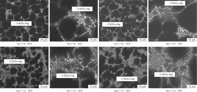 圖12 流變壓鑄 Mg-xGd-3Y-1Zn-0.4Zr (x=8, 10, 12, 14,%)合金鑄態的SEM-BSE圖像
