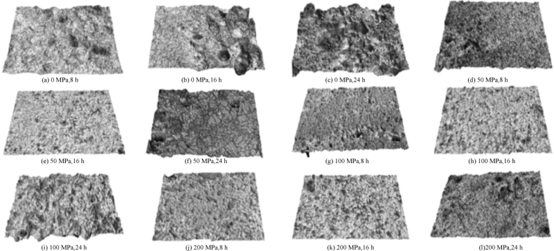 圖19 不同壓力下RSC試樣在不同浸泡時間下的三維腐蝕形貌