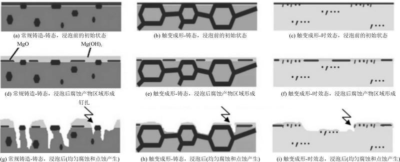 圖20 在0.1 mol/L NaCl水溶液中浸泡試驗中WE43鎂合金表面腐蝕過程的簡化模型 【主要結論】 半固態成形技術因其低成本、短流程、低能耗等特點在Mg-RE合金體系中具有廣闊的應用前景: (1)適用于半固態成形技術的Mg-RE合金成分設計是獲得優異質量鑄件的前提,利用熱力學計算軟件對Mg-RE合金半固態制漿過程中固相率的計算,分析不同合金化元素對fs-T曲線斜率的影響從而確定合金化元素對半固態漿料成形性能的影響。稀土元素的種類及添加量的調控有助于Mg-RE半固態成形鑄件的性能提升。非稀土元素如Ca、Zn、Zr主要作為功能性的合金化元素,有助于半固態漿料的成形性能、鑄件的高溫性能的提升。 (2)半固態漿料的穩定制備是保證成品質量的前提,目前主要聚焦于半固態漿料的制備技術。液相法制備半固態漿料時往往輔以外物理場,可以獲得較大體量的半固態漿料,缺點是制備工藝復雜,對設備要求高,容易產生缺陷。固相法制備半固態漿料時對設備要求不高,并且非擾動的加熱可以避免絕大多數氧化缺陷,缺點是零件毛坯尺寸小,制備大件時對設備要求高、組織偏析嚴重。 (3)Mg-RE合金的半固態成形技術主要包括半固態高壓壓鑄、半固態擠壓鑄造,采用半固態成形后的高壓壓鑄的鑄件可以進行熱處理強化,從而發揮Mg-RE合金時效硬化的優勢。壓力鑄造下的微觀組織致密度得到提升,避免了孔洞、氣孔等鑄造缺陷對鑄件的不利影響。 (4)利用半固態成形技術可在一定程度上改善Mg-RE合金的室溫、高溫拉伸性能和耐腐蝕性能。而半固態成形在Mg-Al合金中的研究還發現高溫抗蠕變性能和抗疲勞性能得到提升,有望對Mg-RE合金起到類似的效果。 采用半固態成形技術制備的Mg-RE半固態合金表現出的力學性能尤其是高溫力學性能的提升潛力巨大,對于發展耐熱鎂合金提供了新思路。針對目前存在的問題,鎂稀土合金半固態成形技術的發展需重點關注以下方面: (1)從合金成分的設計出發,研究添加微量元素對鎂稀土合金半固態加工窗口的進一步拓寬,并對實現初生相尺寸、體積分數的穩定控制提出了要求。 (2)開發針對半固態漿料熔體凈化工藝,實現低溫凈化,保證半固態漿料的純凈度,優化當前已有制漿工藝或者開發新型高效、綠色友好的制備工藝有助于鎂稀土合金半固態成形的實踐。 (3)半固態成形鎂稀土合金的成形工藝參數探索,結合仿真模擬軟件實現對鑄造流程的控制,同時還需開發面向Mg-RE合金半固態成形的專用設備。 (4)利用鎂稀土合金的優勢,重點關注半固態成形鎂合金的熱處理制度及相應狀態的力學性能,尤其應關注其高溫蠕變變形行為和疲勞斷裂行為等。 【中文引用格式】 汪存龍,王翔宇,謝赫,等. 半固態成形鎂稀土系鎂合金研究進展[J] 本文轉載自:《特種鑄造及有色合金》 |