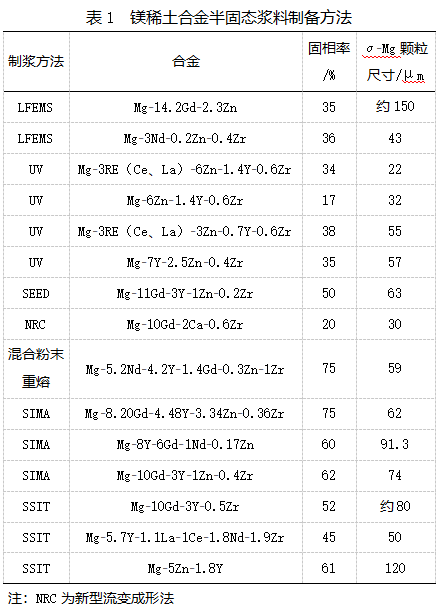 圖2 基于Scheil方程的相圖熱力學計算得到的固相率與溫度關系曲線(曲線上的數字表示斜率) 2、鎂稀土合金半固態漿料制備研究進展 討論了半固態成形鎂稀土系鎂合金的漿料制備技術。半固態加工技術分為流變成形和觸變成形,關鍵在于制備出高質量的漿料,其中α-Mg顆粒的尺寸和形貌對漿料質量至關重要。制漿過程中,需要產生細小、近球形的初生相以獲得良好的流動性。研究者提出了多種非枝晶初生相形成機制的假說,包括枝晶臂斷裂、枝晶臂根部重熔和生長控制機制。外場如機械攪拌、電磁攪拌和超聲波振動等可促進α-Mg由玫瑰狀向球狀轉變。另一種制備方法是通過升溫合金錠至半固態溫度區間獲得漿料,其中半固態等溫熱處理法和應變誘導熔化激活法應用廣泛,固相法制漿參數主要包括加熱溫度和保溫時間。目前,半固態制漿方法有近30種,代表性工藝包括雙螺桿攪拌法、電磁攪拌法等。氣泡攪拌法在鎂合金半固態漿料制備中得到深入研究,優化后的制漿參數可獲得細小、球形的半固態漿料。鎂稀土合金體系半固態漿料制備研究較少,低頻電磁攪拌法可成功制備Mg-Gd-Zn、Mg-Nd-Zn合金半固態漿料,通過優化工藝參數和成分得到質量較好的半固態漿料。在Mg-Y-Zn、Mg-RE-Y-Zn合金半固態制漿中引入超聲波振動,可促進α-Mg顆粒的球化。流變成形Mg-RE合金的制漿工藝中,引入Mg-Zr中間合金也是制備良好漿料的有效方法。觸變成形的制漿方法主要包括在凝固時引入外場、細化劑、細小的初生相顆?;蛩苄宰冃蔚?,然后將鑄錠重新加熱至半固態溫度區間獲得組織較好的漿料,其中應變誘發熔化激活法和半固態等溫熱處理法研究較多。觸變法制備半固態漿料可以穩定地制備出合格的半固態坯料,且在熔體純凈度方面可以避免絕大多數氧化缺陷,有望成為制備高性能鎂稀土合金半固態漿料的重要方法。