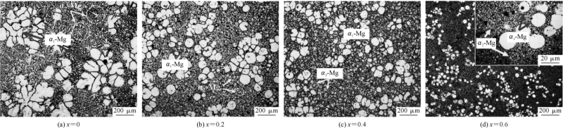 圖6 Mg-10Gd-2Ca-xZr(x=0,0.2,0.4,0.6,%)合金半固態漿料微觀組織