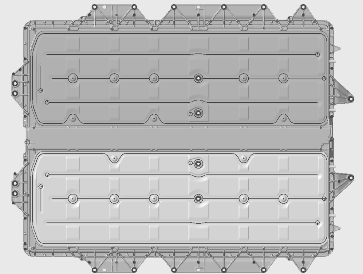 ![]() 圖1 釬焊水冷板電池托盤 原標題:超大型一體化電池托盤的攪拌摩擦焊技術研發及應用 新能源電池托盤所承裝的電池模芯方式多樣,各家電芯制造廠及整車廠的電池熱管理方式不同,電池托盤可以集成冷卻管道,也可采用單獨的冷卻方式。 攪拌摩擦焊技術自20世紀90年代發明以來,在國內外均得到了廣泛的研究與應用,已經成功應用于航空、航天、船舶、汽車、電子、電力等領域。隨著技術的不斷完善和創新,其應用領域將進一步向新能源、醫療器械、環保設備等領域拓展。近年來,隨著國內新能源汽車的飛速發展,新能源汽車電池托盤焊接、電機部件焊接、底部部件焊接、電控箱及其他部件焊接都在廣泛應用攪拌摩擦焊。 攪拌摩擦焊是一種固態焊接技術,在焊接過程中,攪拌頭高速旋轉并插入被焊接材料的接頭處,通過攪拌頭與材料之間的摩擦熱和機械作用,使材料發生塑性變形并實現連接。相比于傳統的熔化焊接方法(如弧焊、氣焊等),攪拌摩擦焊具有焊接接頭質量好(接頭為細晶鍛造組織結構,無氣孔、裂紋、夾渣等缺陷)、殘余應力低、變形小、可實現多種接頭形式的焊接、焊接效率高、能在較厚的材料范圍內實現單焊道焊接成形、接頭強度高、疲勞性能好、沖擊韌性優異、焊接成本低(無焊接材料消耗,不需要填絲和保護氣體)以及焊接操作簡單便于實現自動化焊接等特點。 超大型一體化電池托盤的焊道長度是傳統型材拼接的電池托盤焊道長度的3倍以上(傳統型材拼接的電池托盤都是在產品四周攪拌摩擦焊焊一圈,一體化電池托盤焊道存在于產品四周和中間),攪拌摩擦焊過程中攪拌頭的運動軌跡和焊接參數的均勻性控制難度增加。保證在整個托盤焊接區域內都能實現良好的焊接質量,避免出現局部焊接缺陷,如未焊透、弱連接等問題,是需要解決的重要挑戰。本研究針對超大型一體化壓鑄電池托盤的攪拌摩擦焊工藝進行研究,旨在為相關生產提供參考。 圖文結果 目前市場上常見的大型型材拼接電池托盤電池冷卻方式為在電池托盤本體安裝多層釬焊的水冷板(見圖1),但該方式成本高,整體質量大。目前我司在制造大型一體化壓鑄電池托盤時,創新設計為在電池托盤本體集成水冷通道(見圖2),再利用攪拌摩擦焊工藝把一塊單層的鋁板焊接到電池托盤本體上形成水冷通道,大幅降低了成本,減輕整體的質量,通過鑄件本體就可以實現復雜的水路。 我司為某整車廠開發的大型電池托盤見圖3,該產品尺寸為2 000 mm×1 600 mm×123 mm,最薄壁厚為3 mm,需要攪拌摩擦焊安裝兩塊A5052合金材質,尺寸為1 750 mm×551 mm×2 mm的水冷板。攪拌摩擦焊的焊道共12條,焊接軌跡總長度為21 m,焊道軌跡復雜,焊接后產品變形大,電池模組平面度要求0.8 mm以內,裝配完水冷板后總質量為60 kg。 該電池托盤的攪拌摩擦焊難點主要體現為:①攪拌摩擦焊(FSW)水冷板厚度?。? mm),FSW焊接過程需要鋁板與鑄件貼平,才能保證焊接質量,一旦翹起變形就會導致焊接不良。因此焊接時需對水冷板壓緊,焊接后及時釋放壓緊,焊接設備要求邊壓緊、邊焊接、邊釋放,做到有效配合;②焊道長21 m,路徑復雜,對焊接設備的軌跡精度控制要求高;③產品平面尺寸大、易變形,且變形量波動幅度大,導致FSW焊接夾具的設計與制造難度大;④焊接強度≥本體性能的70%。