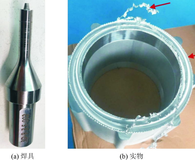圖3 一體化電池托盤產品圖 目前攪拌摩擦焊焊具根據軸肩分類,可以分為動軸肩焊具和靜軸肩焊具。動軸肩在焊接過程中會隨著攪拌頭一起旋轉,這使得軸肩與被焊接材料之間產生相對運動,通過摩擦生熱來促進材料的軟化和流動,有助于形成良好的接頭。動軸肩能夠提供較大的摩擦熱輸入,有利于提高焊接效率和接頭質量。其可以使接頭金屬材料充分塑化,并且在攪拌作用下,材料的混合和均勻性較好,能夠減少接頭中的缺陷。圖4為動軸肩焊具和焊縫實物圖。 靜軸肩攪拌摩擦焊采用軸肩與攪拌針分體式設計,在焊接過程中內部攪拌針轉動,而外部軸肩不轉動,僅沿焊接方向行進。圖5為靜軸肩焊具和焊接實物圖。由于軸肩不轉動,表面熱輸入減小,工件厚度方向熱量分布相對較均勻;接頭摩擦熱量分布較為均勻,組織均勻性好,接頭表面光潔,飛邊量小。此外,靜軸肩能夠有效抑制接頭材料擠出,減少接頭減薄,可實現角接頭結構,降低孔洞、隧道等缺陷的形成幾率,接頭性能優良。