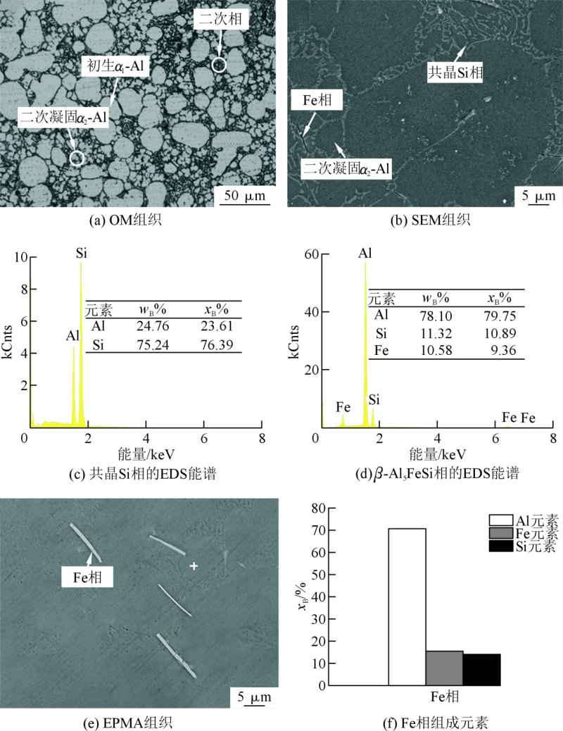 圖1 半固態壓鑄Al-Si-Fe-Mg合金的顯微組織、EDS分析EPMA和Fe含量