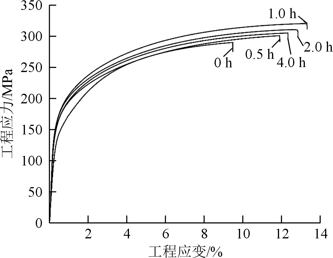 圖5 不同固溶時間處理對合金中共晶Si相的等效直徑和形狀因子的影響 圖6為不同固溶時間下半固態壓鑄Al-Si-Fe-Mg合金的EPMA組織。基體中溶質原子的固溶度分析結果見表2。結果表明,當固溶時間為0.5 h時,部分Si和Mg元素溶于基體,Cu元素幾乎完全溶于基體。隨著固溶時間延長至1 h時,Si和Mg元素在基體中的固溶度增加。隨著固溶時間繼續延長,Si和Mg元素在基體中的固溶度保持不變。 圖7為不同固溶時間下半固態壓鑄Al-Si-Fe-Mg合金的工程應力-應變曲線。可以發現,隨著固溶時間從0 h延長至4 h,合金的抗拉強度、屈服強度和伸長率均先增加后降低。當固溶時間為1 h時,合金的力學性能最優,其抗拉強度、屈服強度和伸長率分別為320.1 MPa、224.2 MPa和13.3%。