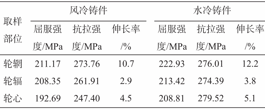 表1 風冷和水冷生產工藝對比 經對比發現該產品班產由原風冷的91件(8 h)提升至110件(8 h),效率提升20.8%。且其力學性能也有大幅提升,見表2。