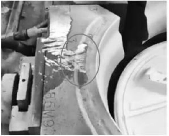 要保證水冷的效果一是要有足夠的壓力來保證流量,二是要根據環境溫度調節水溫。水冷管道在使用一定時間后會產生水垢,使管道內管徑變小,水流量變小,降低冷卻效果,嚴重的會堵塞管道。經過驗證,定期使用酸液可以清除水垢,現在相應的設備和工藝已經很成熟。 3.1 開裂漏水 由于水冷激冷效果強,水冷管道溫差變化大,在生產中極易發生開裂,尤其是在壁厚較薄和焊接部位,見圖6。目前水冷部件的壽命大概在20 000件,還不能達到模具本身的30 000件。