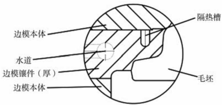 圖6 模具開裂 漏水的原因和對應措施主要有:①材料內部有缺陷,水道位置有渣孔、砂眼;措施:控制模具部件質量和檢驗,防止原材料缺陷導致漏水;②壁厚太薄,在水的激冷作用下開裂;措施:水道在設計時一定要保證安全壁厚;③水槽蓋板和焊縫結構不合理,達不到封閉效果;措施:設計時一定要保證足夠的封閉面和焊接面積,且焊縫不能高于工件表面以免碰傷;④焊接應力導致工件過早開裂;措施:工件在焊接后要去除焊接應力。開發新的水道加工方法,目前開始應用放電打孔工藝,避免在模具上開槽,極大程度上解決了漏水問題,但只能用于非整圈結構。 3.2 調節冷卻強度和范圍 直接冷卻強度速度快,激冷效果強,影響范圍大,必須對冷卻范圍進行調節,否則工藝很難控制。一般調節措施為增加隔熱槽,將不希望受冷部位隔離開,部分隔熱見圖7、整圈隔熱見圖8。