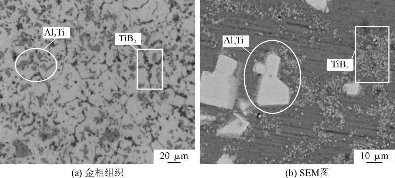 圖4 Al-5Ti-1B中間合金微觀組織 圖5為添加不同含量Al-5Ti-1B中間合金的TiB2/ADC12鋁合金典型金相組織。圖6為α-Al晶粒尺寸統(tǒng)計(jì)。圖7為添加不同含量Al-5Ti-1B中間合金的TiB2/ADC12鋁合金的SEM形貌。圖8為圖7局部區(qū)域?qū)?yīng)的放大形貌及EDS能譜。由能譜分析可知,粗大塊狀相主要含F(xiàn)e、Mn和Si等元素,針狀相主要包含Al和Ti元素,推測(cè)針狀相主要是凝固過程形成的Al3Ti相。結(jié)合相關(guān)研究分析可知,塊狀相主要是α-AlFeMnSi相。以上結(jié)果表明,Al-5Ti-1B可以形核細(xì)化α-AlFeMnSi相。