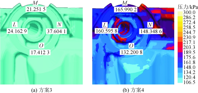 在采用冷卻效果比較好且能解決連接濾清器位置局部燒傷缺陷的金屬3D打印隨形冷卻鑲件的方案基礎上,在Magma模擬軟件中增加兩個邊界條件,即抽真空與常規大氣排氣,再通過模擬結果對比來驗證抽真空工藝與常規大氣排氣對濾清器安裝面氣孔的影響,從而得出優化解決兩個缺陷的組合方案。 從模擬結果分析,根據鑄件的填充氣壓對比,通過對濾清器安裝面的取點測量可知使用方案3抽真空工藝比使用方案4大氣排氣的氣壓數值低,氣壓數值平均低約131.8 kPa,因高氣壓引起的氣孔外露風險降低。圖8為兩個方案的氣壓模擬對比圖,表4為兩個方案的取點氣壓對比數據表。方案3為抽真空排氣模擬,方案4為常規大氣排氣模擬。