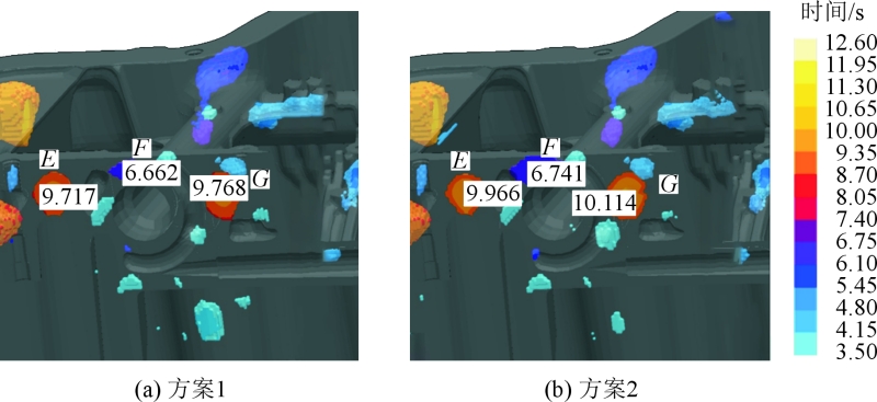 圖6為兩個方案的熱節模擬對比圖,表2為兩個方案的取點熱節對比數據表。從仿真顯示的鑄件凝固的熱節分析,通過風險位置附近的取點測量可知使用方案1比方案2的鑲件熱節數值低,熱節數據差值平均低約0.22 s,因熱節引起的縮孔風險降低。 圖7為兩個方案的燒傷粘模對比圖,表3為取點燒傷粘模對比數據表。從鑄件凝固的燒傷粘模分析,通過風險位置取點測量可知使用方案1比方案2的鑲件燒傷粘模數值低,燒傷粘模數據平均低約0.62 s,因燒傷粘模引起的風險降低。