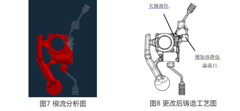 針對齒輪箱周邊的欠鑄,通過模流分析(見圖7)發現,欠鑄部位(見圖8)為進料的末端,且該部位沒有排溢系統,沒法將冷料及型腔內氣體排出,因此考慮在該部位附近增加一處渣包及溢流口,更改后鑄造工藝圖見圖8。