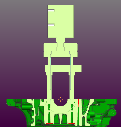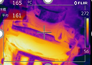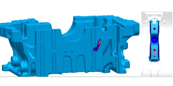 圖2 曲軸箱軸承孔油道附近縮孔 縮孔相關對策 鋁合金壓鑄件產生鑄造缺陷的原因有產品本身的結構特征、模具設計得澆注系統及冷卻系統設計不合理、工藝參數設計不合理等原因[1~4]。根據常見的鑄造缺陷原因以及鋁合金鑄件缺陷處理流程,探索解決鋁合金壓鑄件厚大部位縮孔的相應對策。 前期分析及對策 鑄件縮孔的前期分析從容易操作的工藝參數出發,通過現場測量及觀察,測得模具內澆口厚度為4 mm,計算的內澆口速度為40 m/s,產品壁厚最薄處為4.6 mm;料餅厚度為25 mm;鑄造壓力為60MPa。由經驗可知,模具設計符合產品的結構特征,模具澆注系統應該不存在增壓階段補縮不足的問題。但是,增壓階段的鋁液補縮與料餅厚度和增壓壓力有直接的關系,合適的料餅厚度與鑄造壓力才能形成內部組織致密的鑄件,因此,可以懷疑縮孔是由鑄造壓力偏低和料餅偏薄而導致的。 前期消除鑄件縮孔的對策分為兩個:①鑄造壓力由之前的65MPa提高至90MPa;②料餅厚度有原來的25 mm調整為30 mm。采用上述措施后,經過小批量專流驗證,縮孔率由5%減低為4.8%,效果不明顯,說明工藝參數不是引起鑄件縮孔的主因。 中期分析及對策 由于引起鑄件縮孔的本質原因是鋁液凝固時補縮不足而導致,而模具溫度分布不均容易導致鋁液凝固順序不合理,從而補縮不足,因此,中期對策分析主要從確保合理的模具溫度入手。由產品3D模型可知,鑄件縮孔處壁厚為22.6mm,壁厚較大,容易引起較高的模具溫度。鋁液凝固時,壁厚較大鑄件內部鋁液由于溫度較高,尚處于液相或者固液混合相,而此時內澆口進行補縮的通道可能已經凝固。這樣,在增壓階段鑄件無法進行鋁液補縮,從而有形成縮孔的可能。為確保合適的模具溫度,采用熱成像儀測得脫模劑噴涂后模具最高溫度為272 ℃(見圖3),高于正常的模具噴涂后溫度,其他區域模具溫度及其分布整體正常。因此,需要降低縮孔處模溫。另外,測得此處冷卻水孔底部距離模具型腔表面距離較大為20 mm,因為較大的熱傳遞距離會降低模具的冷卻效果,所以需要對冷卻水孔進行更改。