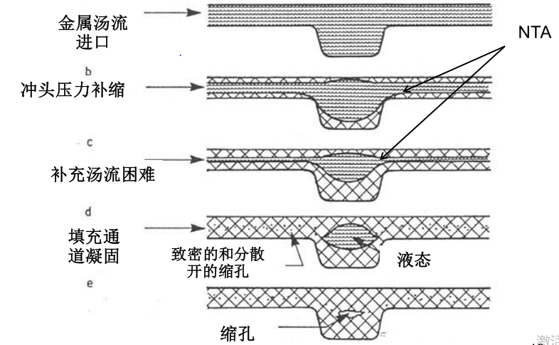 表1 ADC12ZS鋁合金化學成分(wb/%) 鋁合金壓鑄件縮孔形成機理及形態 縮孔形成機理 導致鋁合金壓鑄件縮孔的原因較多,追溯其本源,主要是鋁合金從液相向固相轉變過程中鋁液補縮不足而導致。常見的縮孔原因有:①模溫梯度不合理,導致鋁液局部收縮不一致。②鋁液澆注量偏少,導致料餅薄,增壓階段補壓不足。③模具存在熱結或尖銳區域。④模具的內澆口寬度不夠,面積較小,導致鑄件過早凝固,增壓階段壓力傳遞受阻、鋁液無法補縮。⑤鑄造壓力設置過低,補縮效果較差。圖1為鋁合金鑄件縮孔形成的示意圖。