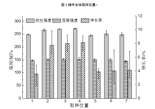 圖7改進后鑄件不同部位的力學性能 與圖4相比,減震塔不同位置的平均抗拉強度最低值由原來225 MPa增加到284 MPa,提高了26%,平均伸長率最低值由原來的3.56 %提高到7.13 %,提高超過100%。由于合金材料及壓鑄參數(shù)無明顯變化,所以改進前后減震塔的屈服強度變化不大。 結(jié)論 (1)真空壓鑄鋁減震塔首次壓鑄后不同位置的抗拉強度值有一定的變化,屈服強度相當,而伸長率差異較大,多個位置平均伸長率低于5%,低于要求。組織觀察可知力學性能較差部位主要存在氣孔和夾渣等鑄造缺陷。