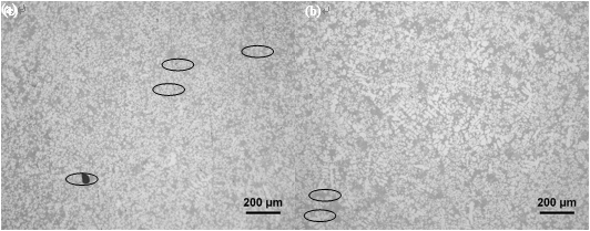 圖4首次試制得到鑄件的不同部位的壓鑄態(tài)力學性能 根據(jù)鑄件本體的力學性能結(jié)果,對1號、3號、5號和6號位置取樣并進行OM觀察,見圖5。可以看出,所有位置的晶粒尺寸基本一致,其組織由細小的α-Al和共晶組織組成(見圖5c)。但1號、5號和6號部位試樣存在明顯的氣孔,尺寸從十幾μm到幾十μm不等(圓圈內(nèi)所示),而3號部位試樣的顯微組織則未發(fā)現(xiàn)明顯的氣孔,這與模擬分析及X射線檢測的結(jié)果一致。氣孔是鋁合金壓鑄件常見的缺陷,其不僅使鑄件的有效受力面積減少,還會造成鑄件局部應(yīng)力集中而成為裂紋源,最終嚴重降低合金的伸長率,一些不規(guī)則氣孔的出現(xiàn),還會使合金的抗拉強度下降。