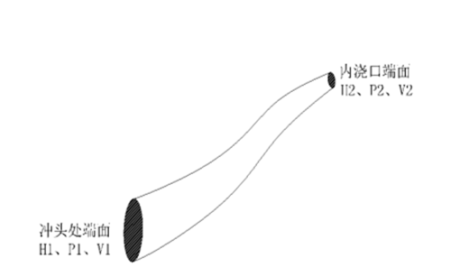 圖2:P-Q圖的設備線 2、P-Q圖的模具線 根據伯努利方程,同一流線上單位質量流體的機械能總和不變,模具澆道處可為下式: (3)式中,H1為沖頭處的高度,mm;P1為沖頭作用在鋁液上的壓力,MPa;v1為沖頭的壓射速度,m/s;H2為內澆口處高度,mm;P2為內澆口出口處大氣壓,MPa;v2為金屬液內澆口處速度,m/s。見圖3。
