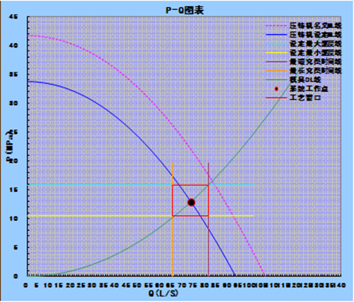 (10)式中,A為沖頭截面積,mm2;G為鑄件及渣包重量,g;ρ為鋁液密度,g/cm3,取2.64g/cm2;ν為速度,m/s; t為填充時間,s。 沖頭直徑的選擇 根據5.1、5.3、5.4.1中的參數,同時初步擬定壓射速度為4.5m/s,由式(10)可知沖頭截面積約為15840mm2,即沖頭直徑約為?142mm,故取沖頭直徑為?140mm。 六、用P-Q圖驗證濾波器腔體的模具設計及優化壓鑄工藝 依以上案例鑄件、模具及壓鑄機的相關參數,可將式(2)和式(6)做出以下P-Q圖,如圖16所示。