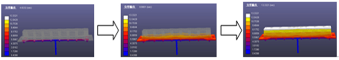 圖10:充型模擬過程 鑄件凝固過程模擬見圖11。可以看出,鑄件從上往下凝固,剛剛開始時,鑄件凝固較快,但整個梁身的冷卻時間比較集中,可能造成補縮不能順利進行,從而造成鑄件的不完整以及梁身的內應力達不到要求;到后期,由于鑄型的溫度有所增加,凝固較慢,靠近澆注系統處最后凝固;根據鑄件凝固過程模擬分析,鑄件內澆道處最先開始凝固,說明鑄件可以通過自身膨脹實現補縮;鑄件從頂部壁薄處開始凝固,壁厚處最后凝固。因此鑄件的凝固復合低壓鑄造原理,由此凝固順序及凝固時間可以驗證改工藝較合理。
