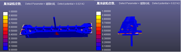 圖11:鑄件凝固過程 鑄件模擬概率缺陷參數見圖12。可以看出,此種方案設計澆注產生的缺陷較少,主要集中在距離澆口較遠處,該處可能出現澆不注、縮孔、縮松等缺陷,但內部加強肋板基本沒有缺陷。通過以上模擬結果分析,鑄件壁最薄處鑄件最先凝固,壁較厚及最后靠近澆口位置處較后凝固,整體缺陷比較少。