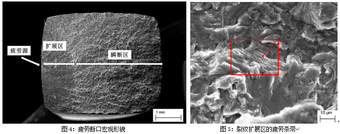 在裂紋穩定擴展階段,試樣斷口表面最重要的顯微特征是“疲勞條帶”,見圖5。疲勞條帶是一系列基本上相互平行的條紋,其與局部裂紋擴展方向垂直。隨著裂紋的進一步擴展,試樣可承載面積逐漸減小。當裂紋擴展到臨界尺寸時,試樣突然斷裂形成瞬斷區,瞬斷區比較粗糙,與材料靜態破壞斷口形貌相似。與低應力水平相比,試樣承受高應力水平時,疲勞擴展區面積較小,瞬斷區面積較大,見圖6。