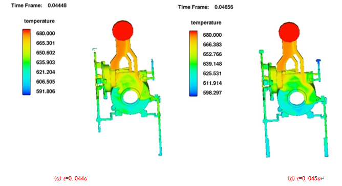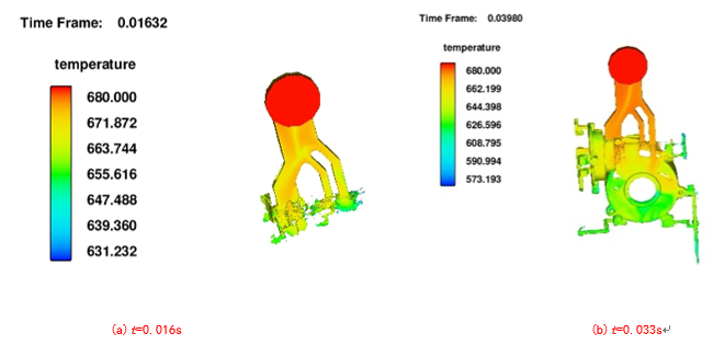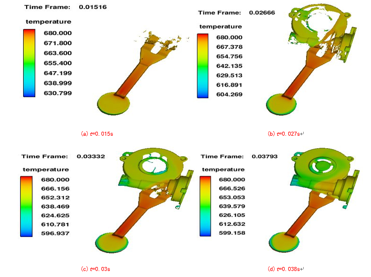 圖5:原始工藝方案 2、數(shù)值模擬與優(yōu)化 2.1 數(shù)值模擬 將原始壓鑄方案導入FLOW-3D軟件中進行數(shù)值模擬,圖6為原始方案流場分布結(jié)果。通過模擬結(jié)果可得,壓鑄件最高溫度為680 ℃,最低溫度約為603 ℃。型腔內(nèi)金屬溫度隨著與內(nèi)澆口距離的增大,其溫度大致呈逐漸降低的狀態(tài)。溫度決定凝固的順序,溫度較低的位置首先凝固,溫度較高的位置凝固較慢。充型過程較不平穩(wěn),在t=0.027 s時發(fā)生液滴飛濺現(xiàn)象。綜合分析得到,在模擬過程中,壓鑄件凝固方式為逐層凝固,并且按照遠離內(nèi)澆口的方向先凝固的順序,所以能夠及時得到補縮,故而不會出現(xiàn)較為嚴重的縮松縮孔。