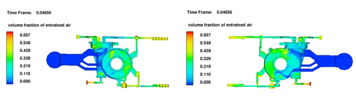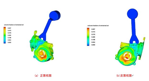 圖10:優(yōu)化方案流動場模擬 圖11為優(yōu)化方案卷氣結(jié)果。從模擬結(jié)果上可以發(fā)現(xiàn),卷氣嚴重的地方集中在溢流槽和排氣槽,說明設(shè)置的溢流槽和排氣槽起到了作用,鑄件上并未發(fā)生卷氣,進一步表明優(yōu)化方案設(shè)計合理可行。