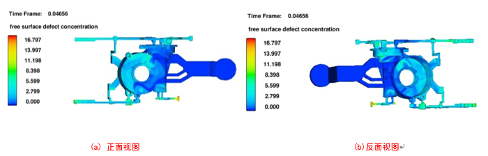 圖8:表面缺陷模擬結(jié)果及分析 2.2 工藝優(yōu)化 原始壓鑄方案卷氣較嚴重,需要進行工藝優(yōu)化,正確選擇澆口的位置和導流方式,對于非良形狀的鑄件多采用多股內(nèi)澆口,設(shè)置3個內(nèi)澆口,內(nèi)澆口寬度為8 mm、10 mm、20 mm。長度為5 mm,增加了內(nèi)澆口截面積從而使得壓射速度提高。為了改善排氣條件,在鑄件兩側(cè)增設(shè)環(huán)形溢流槽,溢流槽1尺寸為A=5 mm,H=8 mm,B=15 mm;溢流槽2尺寸為A=10 mm,H=10 mm,B=15 mm, 溢流槽3尺寸為A=5 mm,H=8 mm,B=15 mm吊耳處增設(shè)溢流槽,尺寸為A=15 mm,H=10 mm,B=20 mm,同時設(shè)置一個圓柱形冒口,R=10 mm,H=15 mm。為了增加排氣效果,改善卷氣,在鑄件端蓋處增加排氣槽。排氣槽用于從型腔中排出空氣及涂料揮發(fā)產(chǎn)生的氣體。為了使型腔中的氣體在壓射時盡可能多的被金屬液排出,將排氣槽設(shè)置在金屬液最后填充的位置。優(yōu)化工藝的三維圖見圖9。