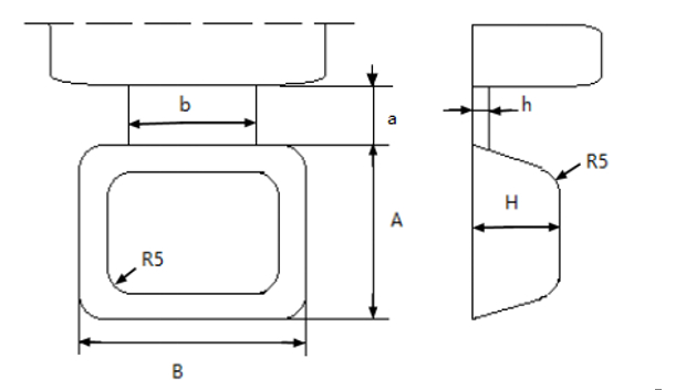 圖4:溢流槽形狀 其中,b、a、h、A分別為溢流口的寬度,長度、厚度,長度。B、H分別為溢流槽的寬度以及厚度。 選用一個此形狀溢流槽具體尺寸為:A=16 mm,a=6 mm,H=7 mm,h=1mm,b=12 mm,B=20 mm;考慮到零件特點,在零件中間增設(shè)一個圓形溢流槽。圓形溢流槽尺寸:R=15 mm,H=12 mm,b=12 mm,a=6 mm,h=1 mm。圖5為原始工藝方案。