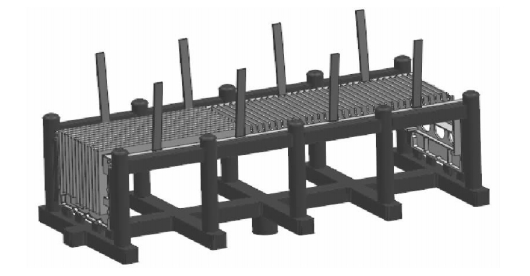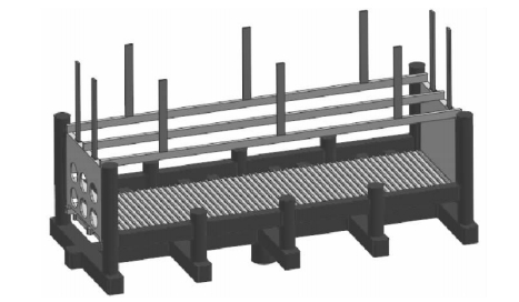 圖2:鑄造工藝設計方案1 兩個側板處采用縫隙式澆道,其中側冒口直徑為Φ40 mm,內澆道厚度為12 mm,長度為190 mm。底板處采用非特定形式的澆注系統,鋁液充滿橫澆道后,從16個內澆道進入鑄件底板,沿6個Φ40 mm 的圓柱澆道 充型,橫澆道、直澆道、內澆道截面積比為1:2.8:4.6。 2.2 方案2 圖3為鑄造工藝設計方案2,鑄件“C”口朝下,采用 縫隙式澆注系統,鑄件及澆注系統結構穩定,不設計加 強筋。在鑄件上設置8處出氣,其截面尺寸為5 mm×20 mm,總截面積為800 mm2。