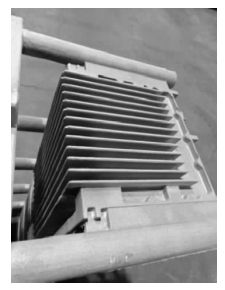 圖5:方案1的砂芯組合方案 5、薄壁殼體鑄件澆注驗證 砂型由國產I-Lead-1800型3D砂型打印機打印,采用100/140目硅砂,打印層厚為0.28 mm。砂型采用水基涂料流涂,涂層厚度≤0.15 mm,并用微波設備烘干。 造型時按照1號、2號、3號順序組芯,使用螺桿緊固。將 整個鑄型放置在低壓鑄造機上并與升液管對接,對接處 進行可靠密封。使用夾具將整個鑄型鎖死在低壓澆注 機上。 考慮到此殼體鑄件形狀復雜、壁厚小,充型鋁液上 升困難,因此適當的增加壓力。壓力設置為3個階段:第一階段:0~6 s,升液壓力增加到7 kPa;第二階段:6~18 s,,充型壓力增加到40 kPa;第三階段:18~300 s,以40 kPa持續保壓。 鑄件成形完好,筋板成形完整,表面無缺陷,鑄件外觀見圖6;鑄件實體取樣的抗拉強度為310 MPa,伸長率為2.5 %,性能符合要求。