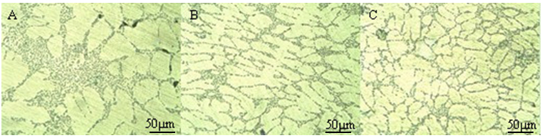 圖7:隨流半固態成形擠壓鑄造示意圖 3、擠壓鑄造大型結構件的組織與性能 擠壓鑄造成形的大型結構件組織性能特點可以概括為細晶、致密和強韌兼備。圖8為低壓鑄造、鑄旋與擠壓鑄造所得A356鋁合金大巴車輪轂的組織(輪緣取樣)對比。可以看出,擠壓鑄造的晶粒尺寸(圖c)比低壓鑄造(圖8a)顯著細化,與鑄旋車輪(圖8b)接近。