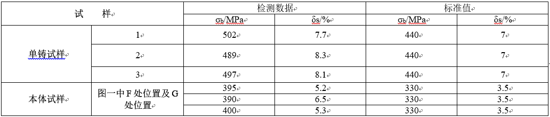 圖6:鑄件方盤(pán)上部氣孔 2.2 力學(xué)性能測(cè)試 ZL205A基座鑄件單鑄試樣與鑄件本體切取試樣力學(xué)性能測(cè)試在WE-100型數(shù)顯液壓萬(wàn)能試壓機(jī)上完成,每個(gè)部位取3個(gè)試樣進(jìn)行測(cè)試并取其平均值,結(jié)果見(jiàn)表3。