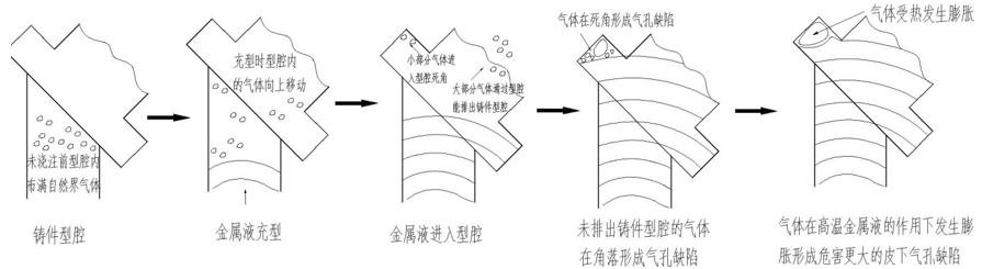 表3:鑄件力學(xué)性能檢測(cè)結(jié)果 3、基座缺陷原因分析 金屬液進(jìn)入型腔,空氣被加熱,出現(xiàn)向上排出鑄型的現(xiàn)象,很小的一部分空氣進(jìn)入了型腔的死角,在金屬熔液熱力作用下膨脹長(zhǎng)大,形成危害性較大的氣孔缺陷,見(jiàn)圖7。