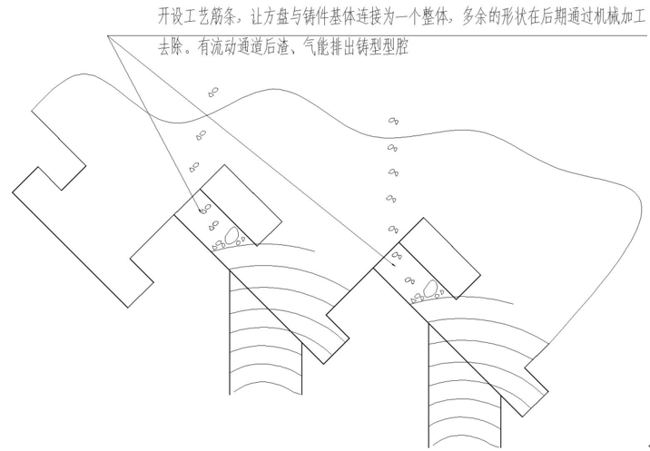 圖7:氣孔缺陷形成過(guò)程 基座鑄件的樹(shù)脂砂鑄型整體高度達(dá)到了1400 mm以上,鑄件型腔復(fù)雜、轉(zhuǎn)角較多,升液速度設(shè)置過(guò)快,合金熔液在型腔內(nèi)產(chǎn)生紊流卷氣;合金熔液流動(dòng)距離遠(yuǎn),到達(dá)鑄型頂部的熔液溫度很低,不利于氣、渣排出鑄件型腔,易于在鑄件中上部產(chǎn)生夾渣及氣孔等缺陷。 基座鑄件頂部左右兩側(cè)的縫隙澆道間距很近,澆注時(shí)鑄件頂部縫隙澆道周?chē)^(guò)熱而導(dǎo)致鑄件頂面處安裝邊產(chǎn)生疏松、縮孔缺陷;同時(shí)鑄件頂部是型腔中渣、氣聚集區(qū),氣和渣阻礙縫隙澆道對(duì)鑄件的補(bǔ)縮,加重了鑄件產(chǎn)生疏松、縮孔缺陷的情況。 4、解決措施 針對(duì)基座鑄件方盤(pán)上部產(chǎn)生氣孔的原因,從鑄造工藝上優(yōu)化鑄件局部結(jié)構(gòu),讓渣、氣有時(shí)間、條件沿著開(kāi)設(shè)的工藝通道排出型腔或進(jìn)入鑄件加工余量范圍內(nèi),有利于減輕鑄件產(chǎn)生渣氣孔缺陷的概率(見(jiàn)圖8)。
