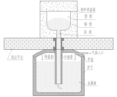 圖1:基座鑄件示意圖 鑄件輪廓尺寸為918 mm×750 mm×305.6 mm,結(jié)構(gòu)復(fù)雜且鑄件多個(gè)形狀只能通過(guò)下芯鑄出;壁厚差異較大,最薄壁厚為16 mm、最厚壁厚達(dá)到了42 mm,鑄件熱節(jié)分散且相互干涉,因此難以實(shí)現(xiàn)順序凝固,給鑄造工藝設(shè)計(jì)帶來(lái)很大的困難。 1.2 基座鑄造工藝方案設(shè)計(jì)及參數(shù)選擇 基座鑄件結(jié)構(gòu)較復(fù)雜,鑄件熱節(jié)多且分散,采用重力澆注很難保證鑄件熱節(jié)處不產(chǎn)生縮孔或疏松。采用低壓鑄造澆注ZL205A合金基座,其基本原理見(jiàn)圖2。其原理是在裝有金屬液的坩堝中,通入干燥的惰性氣體,使金屬液沿著升液管自下而上通過(guò)澆道進(jìn)入型腔,待金屬液充滿型后,增大氣壓,使液面上的氣體壓力保持至鑄件完全凝固,然后解除壓力,開(kāi)型后獲得所需的鑄件。