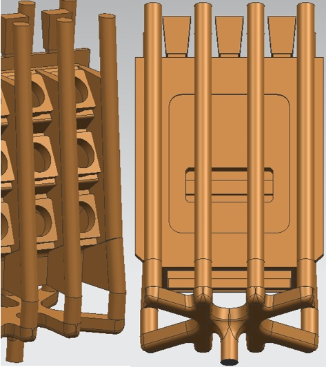 圖2:低壓鑄造基本原理圖 基座鑄造工藝方案見(jiàn)圖3。安裝大面垂直放置,在鑄件安裝大面和9處法蘭盤(pán)部位共開(kāi)設(shè)8道縫隙澆口,鑄件外側(cè)的4道澆口正對(duì)鑄件兩側(cè)側(cè)壁,中部4道澆口正對(duì)鑄件內(nèi)腔的加強(qiáng)筋板,在鑄件頂部相鄰兩道縫隙圓棒之間安放3個(gè)冒口,在熱節(jié)部位安放鋼冷鐵和石墨激冷,形成有利于順序凝固的條件。