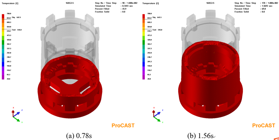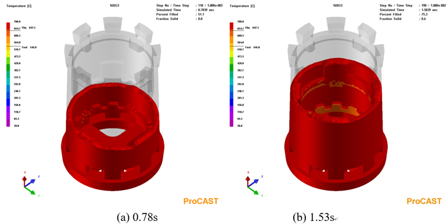 圖6:鑄件充型過程溫度場(chǎng) 圖7為合金液充型結(jié)束后凝固過程中鑄件于不同時(shí)間的溫度分布。可以看出,合金液充型結(jié)束后,鑄件降溫最快區(qū)域?yàn)殍T件頂部的上端框處,因?yàn)樵搮^(qū)域合金液最先進(jìn)入型腔的,再加上上端框處放置著冷鐵,合金液冷卻速度較快,溫度最低;冒口相對(duì)上端框部位的凝固溫度更高,凝固時(shí)間更長(zhǎng),冒口對(duì)上端框區(qū)域具有一定的補(bǔ)縮作用。整個(gè)鑄件自上而下溫度逐漸升高,符合自上而下逐層順序凝固的設(shè)想。隨著時(shí)間延長(zhǎng),鑄件整體的溫度逐漸下降,但整個(gè)降溫過程中鑄件一直保持著自下而上溫度逐漸升高的正溫度梯度,這能最大限度地發(fā)揮冒口的補(bǔ)縮作用,降低鑄件內(nèi)部縮松類缺陷的傾向,對(duì)整個(gè)鑄件的質(zhì)量改善是有利的。但在鑄件的局部區(qū)域存在一些熱節(jié),這些位置相對(duì)于周圍在同一時(shí)間溫度更高,凝固時(shí)間更長(zhǎng),在后期凝固過程中得不到周圍合金液的補(bǔ)縮,容易出現(xiàn)縮松等收縮類缺陷。