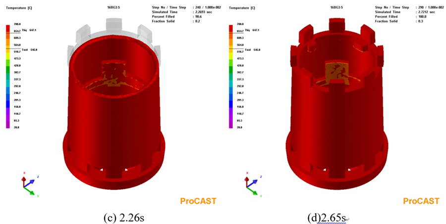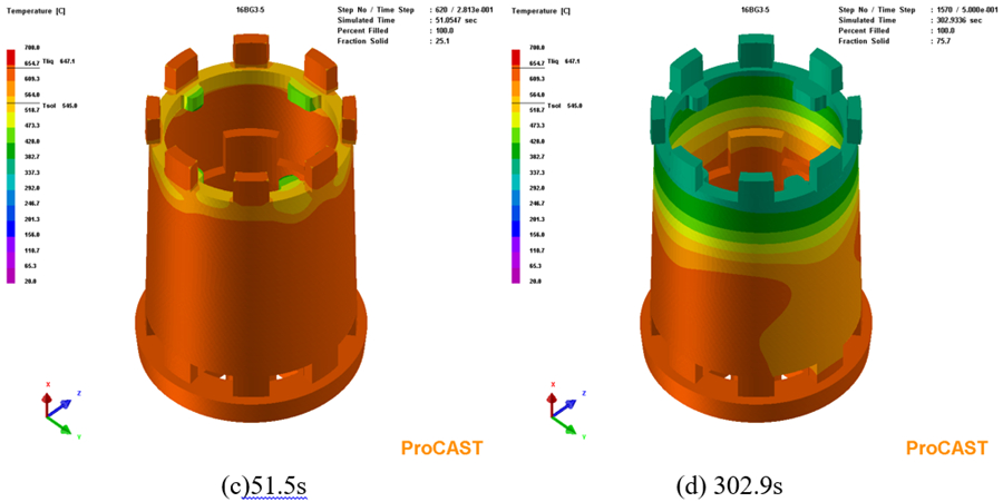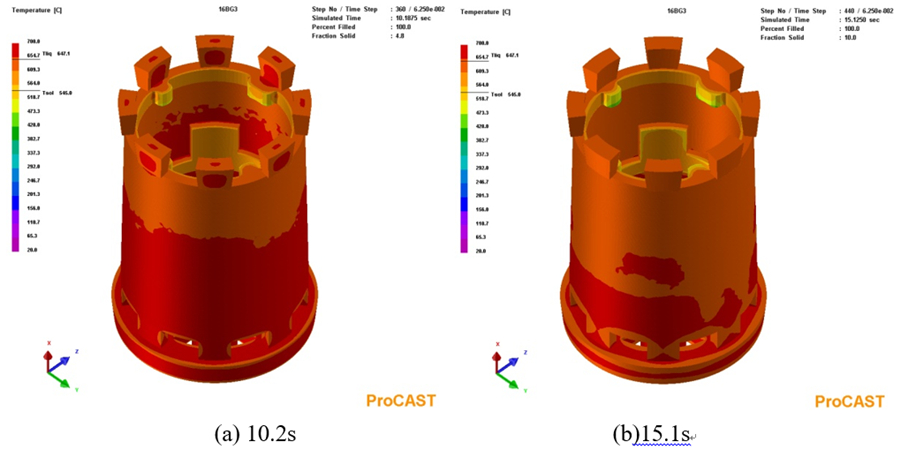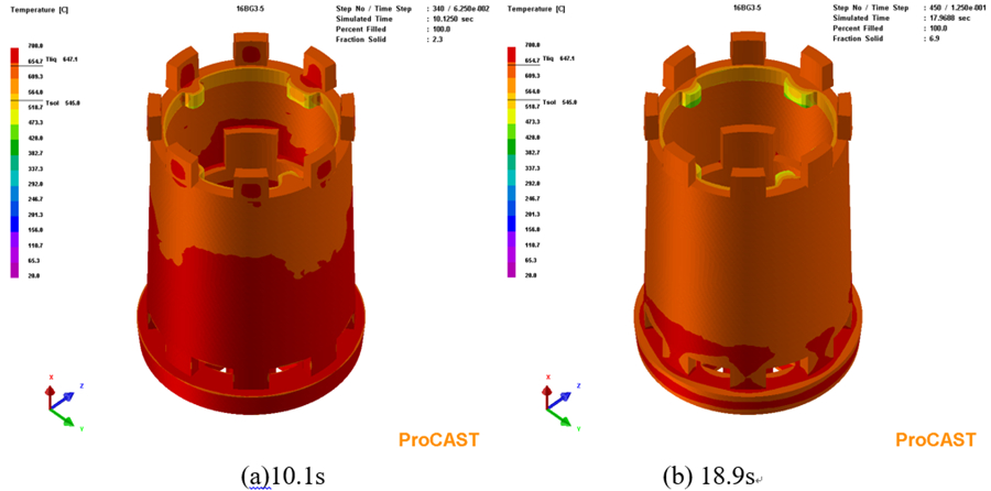 圖10:改進(jìn)設(shè)計(jì)后鑄件充型過程溫度場(chǎng) 圖11為合金液充型結(jié)束后凝固過程中鑄件于不同時(shí)間的溫度分布圖。可以看出,合金液充型結(jié)束后,鑄件降溫最快區(qū)域?yàn)殍T件頂部的上端框處。該區(qū)域合金液最先進(jìn)入型腔,再加上上端框處放置著冷鐵,合金液冷卻速度較快,溫度最低;冒口相對(duì)上端框部位的凝固溫度更高,凝固時(shí)間更長(zhǎng),冒口對(duì)上端框區(qū)域具有一定的補(bǔ)縮作用。整個(gè)鑄件自上而下溫度逐漸升高,符合自上而下逐層順序凝固的設(shè)想。隨著時(shí)間延長(zhǎng),鑄件整體的溫度逐漸下降,但整個(gè)降溫過程中鑄件一直保持著自下而上溫度逐漸升高的正溫度梯度,能最大限度地發(fā)揮冒口的補(bǔ)縮作用,降低鑄件內(nèi)部縮松類缺陷的傾向,有利于改善整個(gè)鑄件的品質(zhì)。鑄件的整個(gè)凝固過程中沒有出現(xiàn)局部過熱情況,完全呈現(xiàn)出自上而下的順序凝固,鑄件的縮松傾向相對(duì)于改進(jìn)前大大減小。