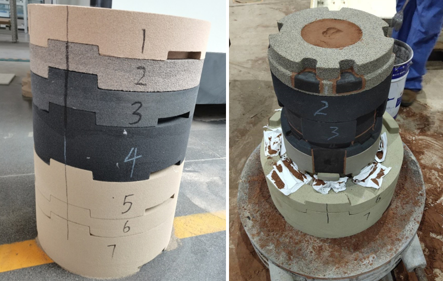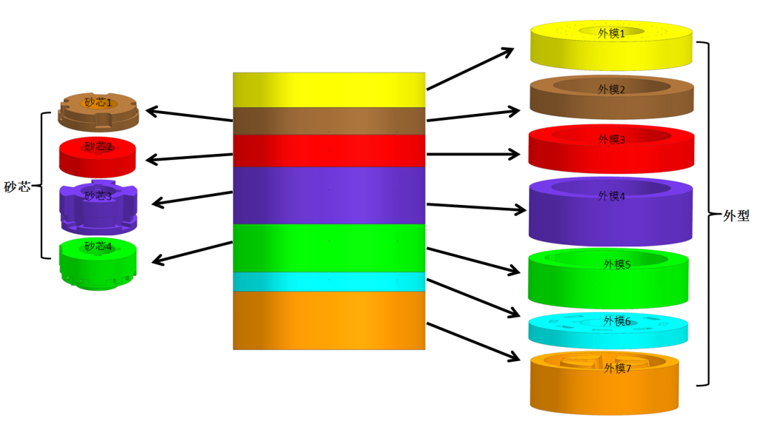 圖3:冷鐵結(jié)構(gòu)及分布示意圖 2.3 復(fù)合鑄型設(shè)計(jì) 為最大限度地實(shí)現(xiàn)澆注系統(tǒng)對(duì)鑄件的補(bǔ)縮,發(fā)揮低壓鑄造的優(yōu)勢(shì),結(jié)合型砂的激冷能力設(shè)計(jì)由上而下的凝固順序,設(shè)計(jì)鑄型結(jié)構(gòu)見圖4,采用無模切砂的方式制備各部分砂塊,外部砂型共分為7層,最上面第1層是硅砂層,第2層是鐵砂,第3層鉻鐵礦砂層,第4層是寶珠砂層,第5層、第6層、第7層是陶粒砂層。砂芯由上而下分為4層,第1層為鐵砂,第2層為鉻鐵礦砂,第3層為寶珠砂,第4層為陶粒砂。