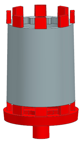 圖1:筒形件三維模型圖 2、鑄造工藝設(shè)計(jì) 2.1 澆注系統(tǒng)設(shè)計(jì) 為了保證鑄件的內(nèi)部質(zhì)量,該筒形件采用低壓鑄造成形,合金液自下而上平穩(wěn)充型,減少氧化,鑄件在一定的壓力下進(jìn)行凝固,組織致密度優(yōu)于重力鑄造致密。設(shè)計(jì)筒形件的澆注系統(tǒng)見圖2,整個(gè)澆注系統(tǒng)的形式為底注雨淋式澆注系統(tǒng),由直澆道、環(huán)形橫澆道和扁平內(nèi)澆道組成。底注雨淋式的優(yōu)點(diǎn)為鑄件的工藝出品率高,切割、粗加工等后處理工序簡(jiǎn)單。環(huán)形橫澆道與直澆道的連接采用“十”字形澆道,有利于合金液的流量分配更加均勻合理,各個(gè)內(nèi)澆口進(jìn)入型腔的合金液的溫度也更加均勻。 由于鎂合金非常容易氧化,8個(gè)直澆道在筒形件下端框處均勻分布,合金液自下而上平穩(wěn)充型,減少了合金液的飛濺、卷氣等,減少合金液的氧化,從而減輕合金液的氣孔、氧化夾渣缺陷傾向。鑄件上方的8個(gè)冒口也具有貯氣和集渣的作用,進(jìn)一步減輕了合金液的氣孔、氧化夾渣缺陷傾向。同時(shí)型腔上方的合金液一直比下方的合金液先進(jìn)入型腔,整個(gè)澆注和凝固過程中上方的合金液溫度一直低于下方的合金液溫度,有利于實(shí)現(xiàn)自上而下的凝固順序,充分發(fā)揮內(nèi)澆道的補(bǔ)縮作用,減輕鑄件的縮松傾向,提高鑄件的致密度。