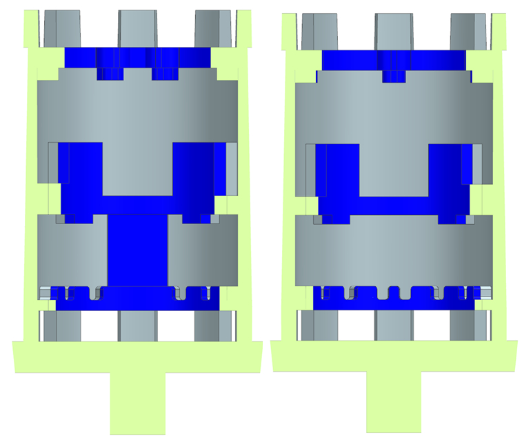 圖9:改進(jìn)后的冷鐵結(jié)構(gòu)及分布示意圖 在改進(jìn)工藝的基礎(chǔ)上,通過ProCAST對(duì)筒形件鑄件的澆注充型過程、凝固過程以及缺陷預(yù)測(cè)進(jìn)行模擬仿真,充型過程見圖10。可以看出,合金液通過內(nèi)澆道進(jìn)入鑄件型腔后,首先進(jìn)入鑄件的下端框厚壁區(qū)域,隨后流經(jīng)艙體中部區(qū)域,之后流到上端框厚壁區(qū)域,最終從鑄件底部由下而上逐步充滿鑄型型腔,鑄件整體呈現(xiàn)自下而上依次充型。整個(gè)過程中,合金液充型比較平穩(wěn),直至全部充滿型腔。在充型過程中,合金液平穩(wěn),不容易發(fā)生卷氣現(xiàn)象,氣孔和氧化夾渣等鑄造缺陷產(chǎn)生的傾向小。