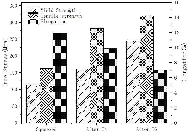 圖6:SiCp/ZL101鋁復合材料在不同熱處理條件下的顯微硬度 3、結論 (1)使用半固態(tài)機械攪拌和近液相線技術成功制備的SiCp/ZL101鋁復合材料,顯微組織為近球形的α-Al和共晶Si組織,SiC能較為均勻地分散在基體中;二次加熱后擠壓獲得SiCp/ZL101復合材料。 (2)經過固溶處理的SiCp/ZL101復合材料顯微組織中共晶Si的形態(tài)發(fā)生了明顯的轉變,由長條狀轉變?yōu)榍驙睿M行時效處理后,基體和增強相界面的析出相數量增加。 (3)固溶+時效處理后的SiCp/ZL101復合材料抗拉強度、屈服強度和伸長率達到了320MPa、244MPa和6.91%,硬度(HV)達到114;斷裂機理由微孔聚集型斷裂轉變?yōu)闇式饫頂嗔眩瑫r效過程析出的第二相和產生的原子聚集區(qū)可能是導致材料塑性大幅下降的原因。
